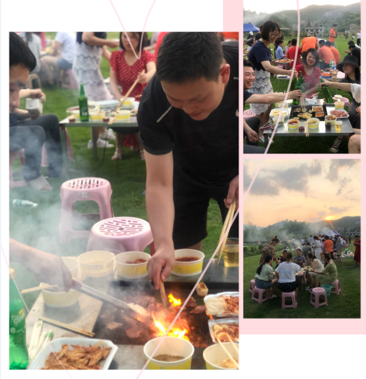 夜幕来临时,晚上同事们来到了山间草地上串起烧烤、唱起歌。篝火晚会,处处欢声笑语。原本宁静的乡间夜晚回响着同事们阵阵欢声笑语。
